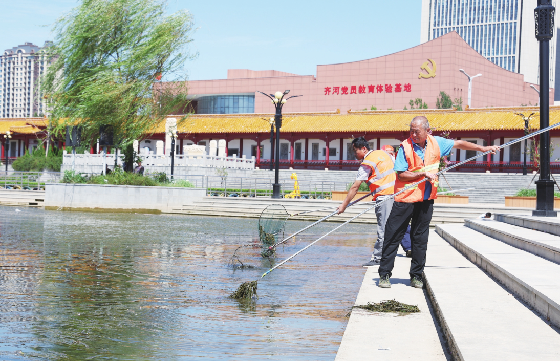 齊河縣環(huán)保志愿者正在清理水面垃圾