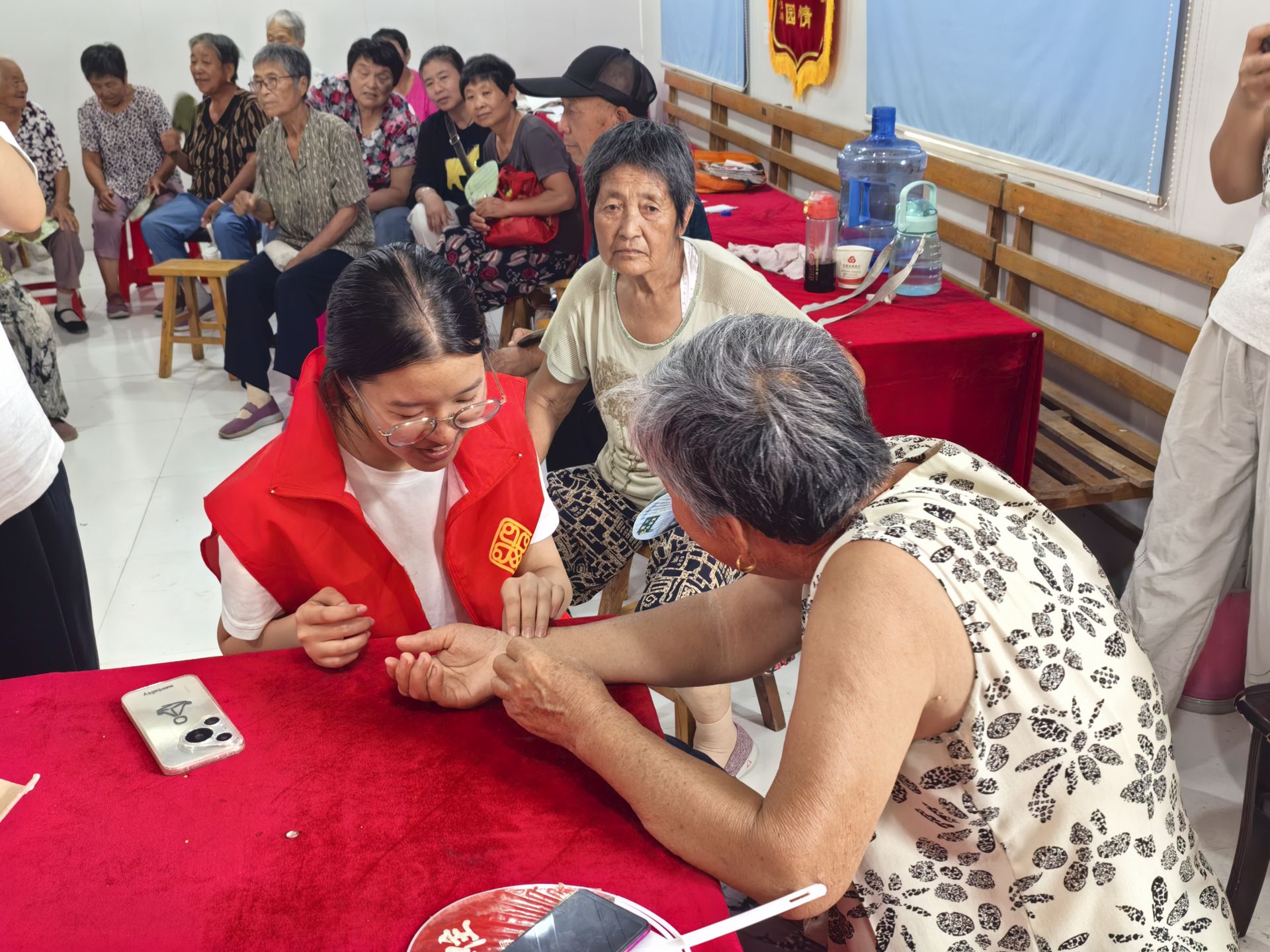 活動期間,志愿者設(shè)立了臨時義診點(diǎn),為居民提供推拿按摩、中醫(yī)脈診、量血壓等基礎(chǔ)醫(yī)療服務(wù),與此同時,志愿者擔(dān)當(dāng)起“健康科普使者”,向居民講解了中醫(yī)防暑知識,圍繞飲食、作息及穴位等多個方面的醫(yī)療健康知識,傾聽居民健康困惑,給予針對性建議?;顒悠陂g志愿者還為居民現(xiàn)場教授八段錦,幫助其掌握簡便易行的養(yǎng)生方法。