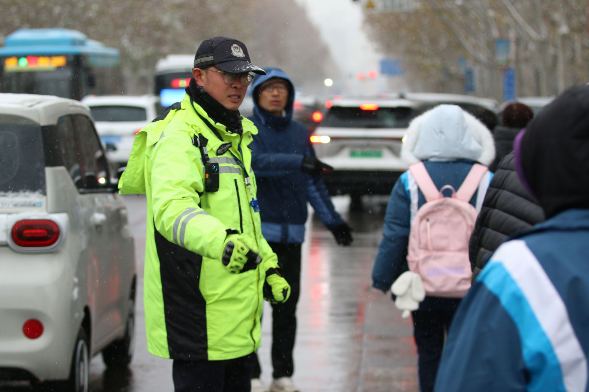 在城市道路上,警方在事故易發(fā)路段,增設(shè)完善了警示提示標(biāo)志、LED顯示屏和爆閃警示燈等安全設(shè)施。對(duì)涵洞橋梁等重點(diǎn)路段,加大巡邏管控力度,采用定點(diǎn)執(zhí)勤與流動(dòng)巡邏結(jié)合,及時(shí)排查處理風(fēng)險(xiǎn)隱患,確保通行順暢。?利用車載喇叭循環(huán)播放安全提示音頻,提醒過往市民注意行車安全,引導(dǎo)車輛減速慢行。晚高峰時(shí)段,民輔警們提前奔赴各個(gè)路口,頂風(fēng)冒雪堅(jiān)守崗位,指揮車輛安全、有序通行。