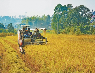 10月12日,在安徽省安慶市岳西縣溫泉鎮(zhèn),農(nóng)機(jī)手駕駛收割機(jī)收割水稻。