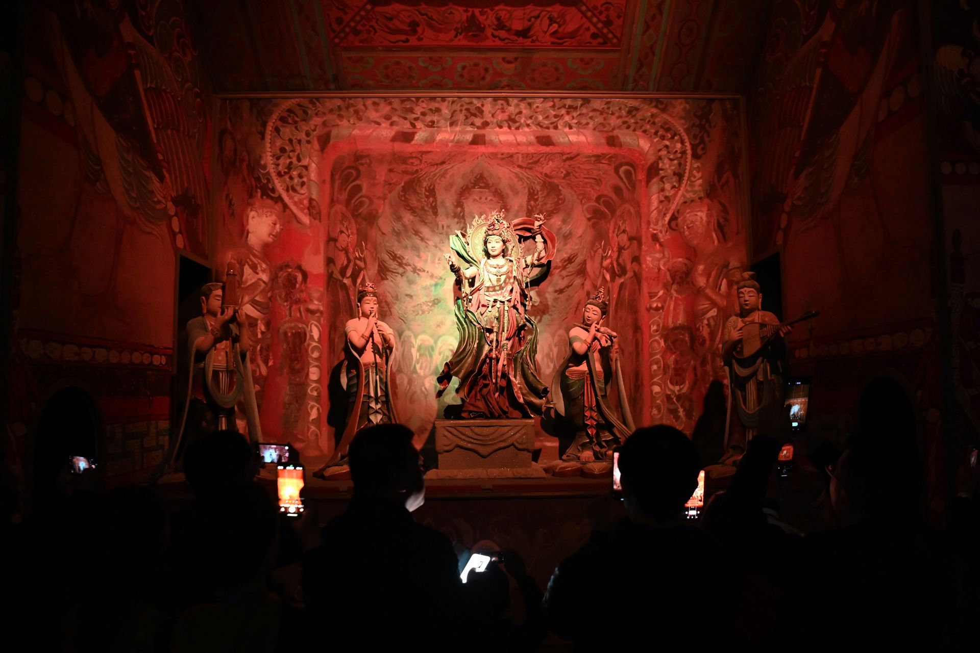 10月12日,參加“世界市長(zhǎng)對(duì)話·敦煌”活動(dòng)的中外嘉賓觀看洞窟式沉浸體驗(yàn)劇《樂(lè)動(dòng)敦煌》。