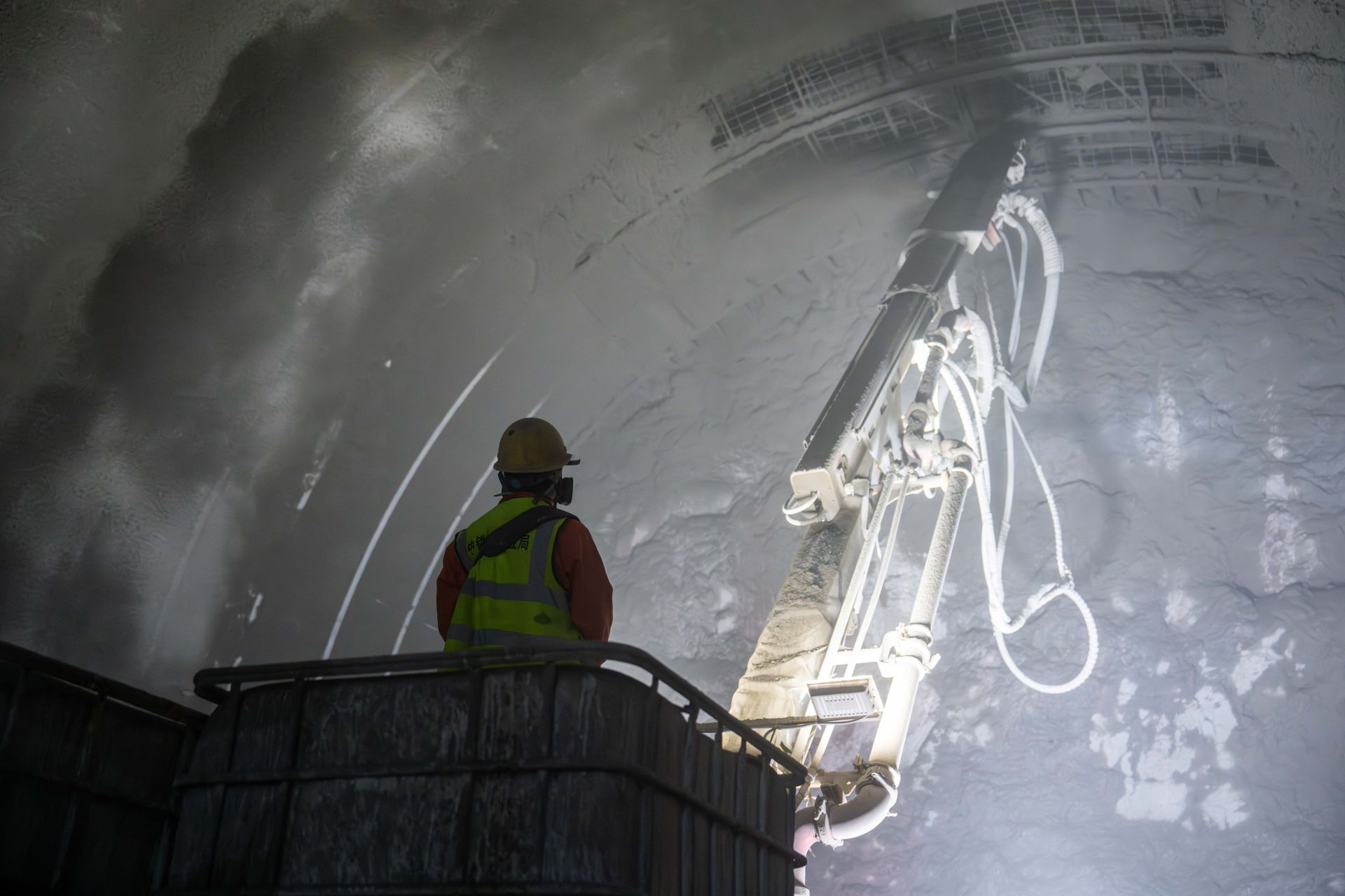 11月1日,在邵永高鐵東安隧道施工現(xiàn)場(chǎng),中鐵二十五局工人操作濕噴臺(tái)車進(jìn)行噴漿作業(yè)。